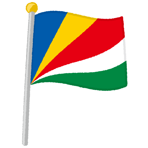 旗掲揚ポールに掲げて風になびくセーシェル共和国国旗のイラストです。地理・地図資料や運動会のチラシ・配布プリント・ポスターなどいろいろとご利用ください♪